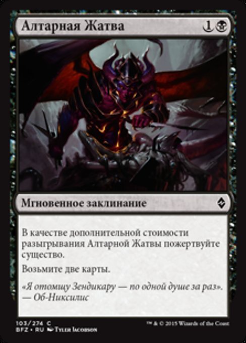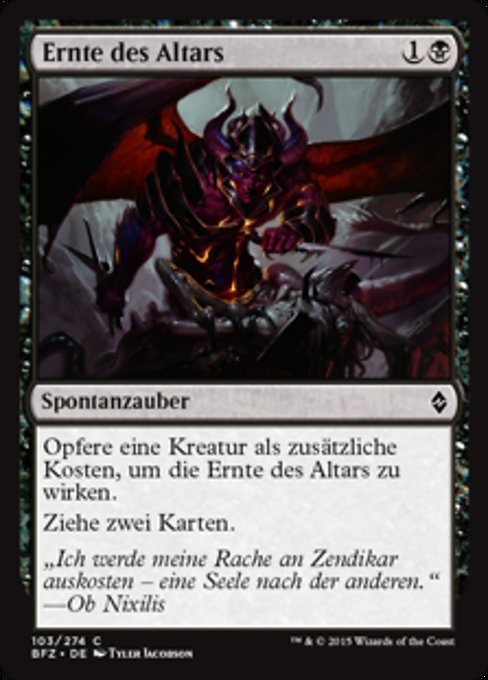 ![]() Variations— Parts— | Colheita do AltarComo custo adicional para conjurar Colheita do Altar, sacrifique uma criatura.Compre dois cards.
