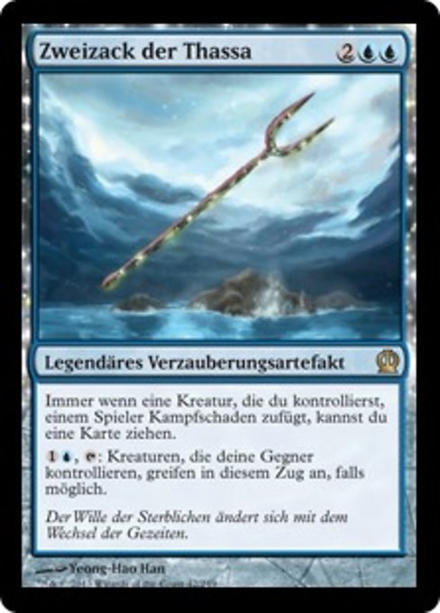 |  Variations— Parts— | Zweizack der ThassaImmer wenn eine Kreatur, die du kontrollierst, einem Spieler Kampfschaden zufügt, kannst du eine Karte ziehen.