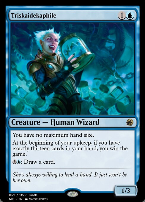 LegalitiesLegal Duel Brawl Penny Legacy Modern Pioneer Vintage Historic Timeless Commander Gladiator Oathbreaker Not Legal Predh Future Pauper Alchemy Standard Oldschool Premodern Standardbrawl Paupercommander RulingsTriskaidekaphile's triggered ability will trigger only if you have exactly thirteen cards in your hand as your upkeep starts. If you have fewer cards in your hand, you won't be able to draw cards during your upkeep in time to cause the ability to trigger.
