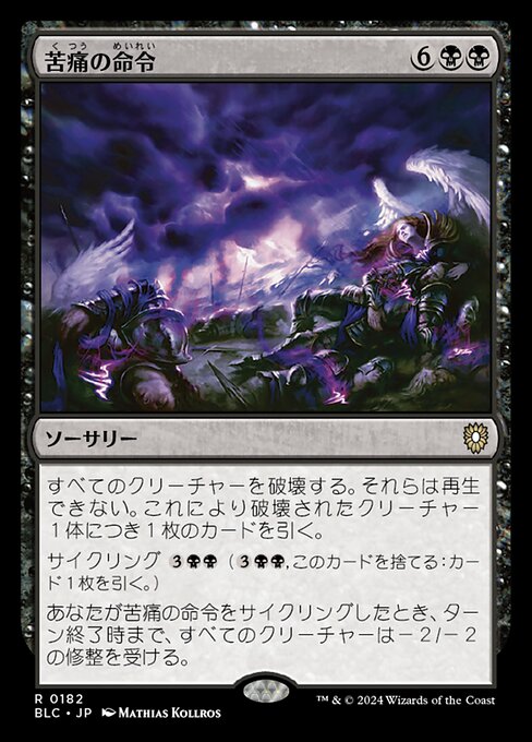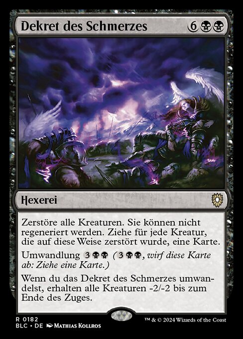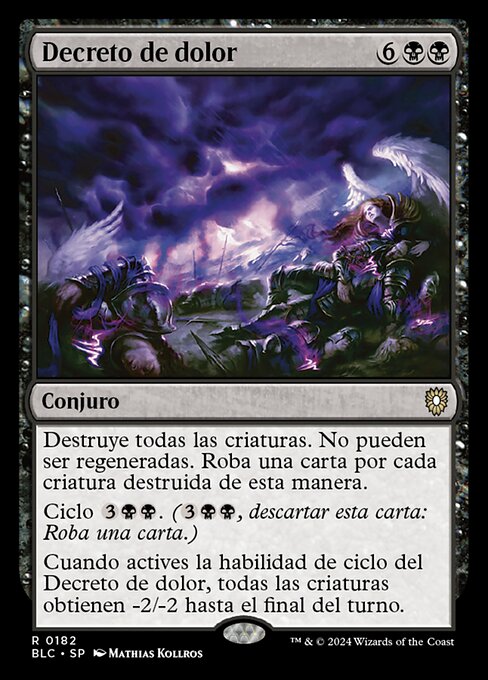 ![]() Variations— Parts— | Decree of PainDestroy all creatures. They can't be regenerated. Draw a card for each creature destroyed this way. Cycling When you cycle this card, all creatures get -2/-2 until end of turn.