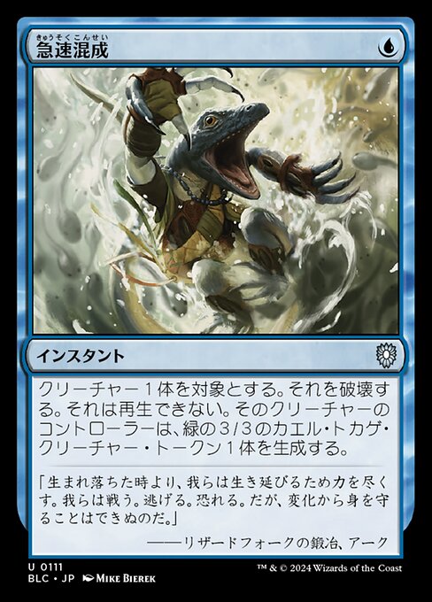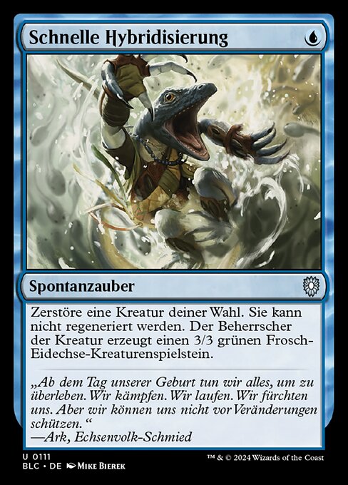 ![]() Variations— Parts— | Hibridación rápidaDestruye la criatura objetivo. No puede ser regenerada. El controlador de esa criatura crea una ficha de criatura Lagarto Rana verde 3/3.