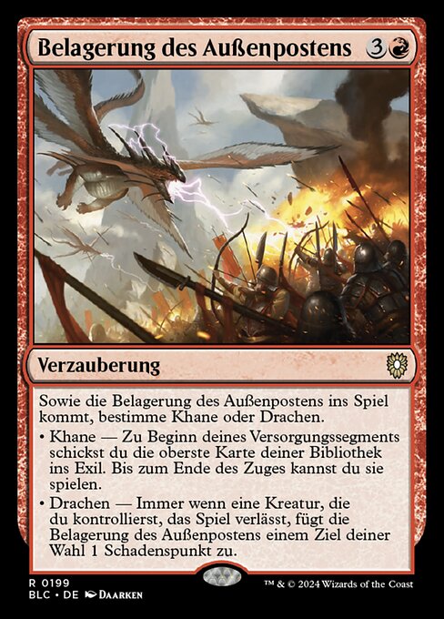 |  Variations— Parts— | Asedio al destacamentoEn cuanto el Asedio al destacamento entre, elige kans o dragones. • Kans — Al comienzo de tu mantenimiento, exilia la primera carta de tu biblioteca. Hasta el final del turno, puedes jugar esa carta. • Dragones — Siempre que una criatura que controlas deje el campo de batalla, el Asedio al destacamento hace 1 punto de daño a cualquier objetivo.