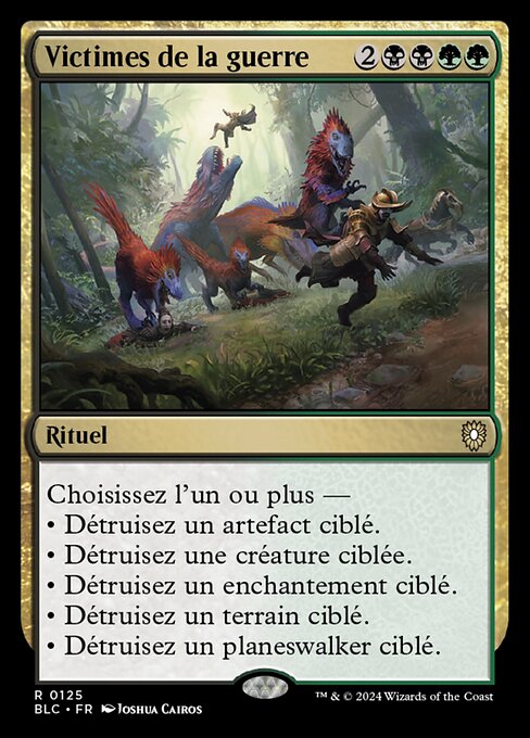 ![]() Variations— Parts—  | Victimes de la guerreChoisissez l'un ou plus — • Détruisez un artefact ciblé. • Détruisez une créature ciblée. • Détruisez un enchantement ciblé. • Détruisez un terrain ciblé. • Détruisez un planeswalker ciblé.