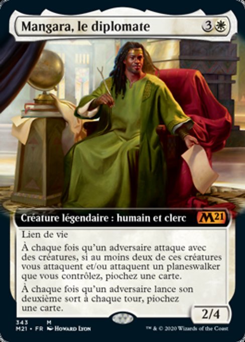 ![]() Variations— Parts— | Mangara, le diplomate2 / 4 Lien de vie À chaque fois qu'un adversaire attaque avec des créatures, si au moins deux de ces créatures vous attaquent et/ou attaquent des planeswalkers que vous contrôlez, piochez une carte. À chaque fois qu'un adversaire lance son deuxième sort à chaque tour, piochez une carte.
