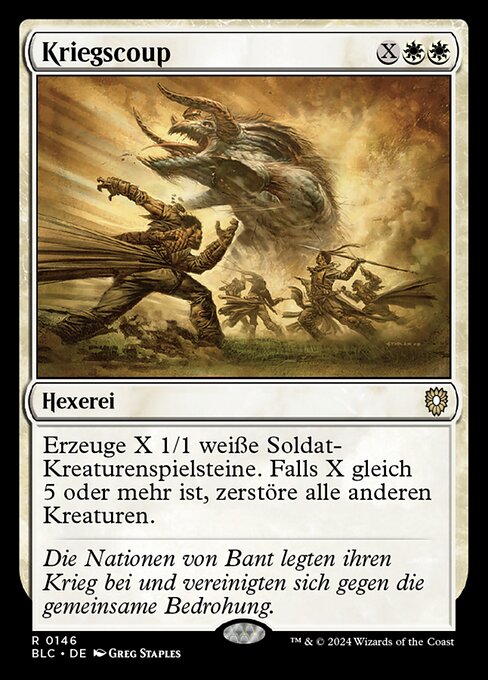 ![]() Variations— Parts— | Coup d'état militaireCréez X jetons de créature 1/1 blanche Soldat. Si X est supérieur ou égal à 5, détruisez toutes les autres créatures.