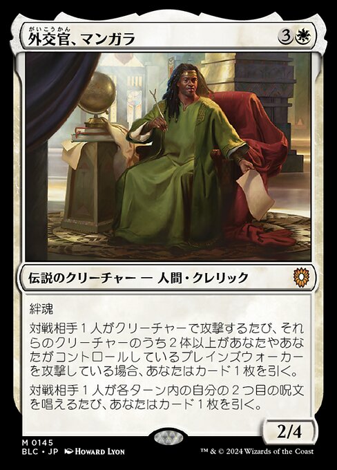 ![]() Variations— Parts— | 外交官、マンガラ2 / 4 絆魂 対戦相手1人がクリーチャーで攻撃するたび、それらのクリーチャーのうち2体以上があなたやあなたがコントロールしているプレインズウォーカーを攻撃している場合、あなたはカード1枚を引く。 対戦相手1人が各ターン内の自分の2つ目の呪文を唱えるたび、あなたはカード1枚を引く。