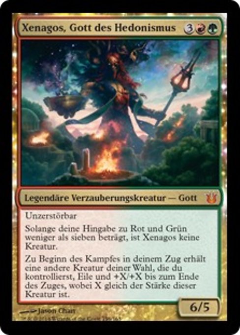 ![]() Variations— Parts— | Xenagos, God of Revels6 / 5 Indestructible As long as your devotion to red and green is less than seven, Xenagos isn't a creature. At the beginning of combat on your turn, another target creature you control gains haste and gets +X/+X until end of turn, where X is that creature's power.