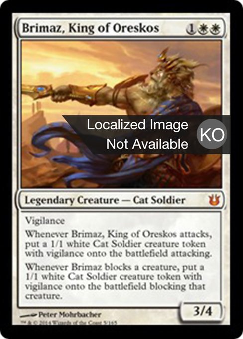 ![]() Variations— Parts— | Brimaz, rey de Oreskos3 / 4 Vigilancia. Siempre que Brimaz, rey de Oreskos, ataque, pon en el campo de batalla atacando una ficha de criatura Soldado Felino blanca 1/1 con la habilidad de vigilancia. Siempre que Brimaz bloquee a una criatura, pon en el campo de batalla bloqueando a esa criatura una ficha de criatura Soldado Felino blanca 1/1 con la habilidad de vigilancia.