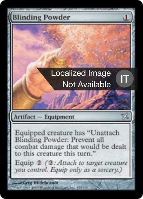 ![]() Variations— Parts— | Blinding PowderEquipped creature has "Unattach Blinding Powder: Prevent all combat damage that would be dealt to this creature this turn." Equip