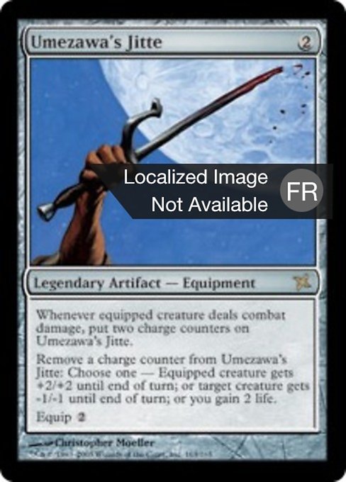 ![]() Variations— Parts— | Umezawa's JitteWhenever equipped creature deals combat damage, put two charge counters on Umezawa's Jitte. Remove a charge counter from Umezawa's Jitte: Choose one — • Equipped creature gets +2/+2 until end of turn. • Target creature gets -1/-1 until end of turn. • You gain 2 life. Equip
