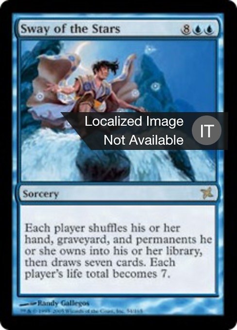 ![]() Variations— Parts— | Sway of the StarsEach player shuffles their hand, graveyard, and all permanents they own into their library, then draws seven cards. Each player's life total becomes 7.
