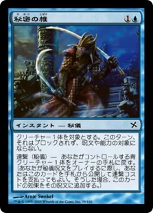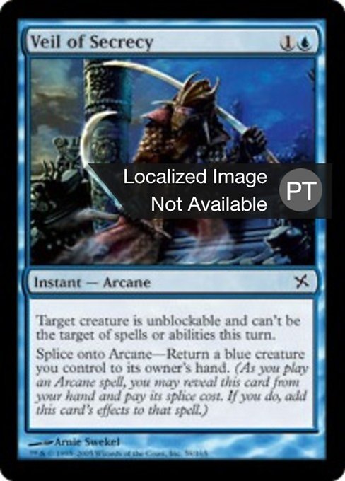 ![]() Variations— Parts— | Veil of SecrecyTarget creature gains shroud until end of turn and can't be blocked this turn. (A creature with shroud can't be the target of spells or abilities.) Splice onto Arcane—Return a blue creature you control to its owner's hand. (As you cast an Arcane spell, you may reveal this card from your hand and pay its splice cost. If you do, add this card's effects to that spell.)