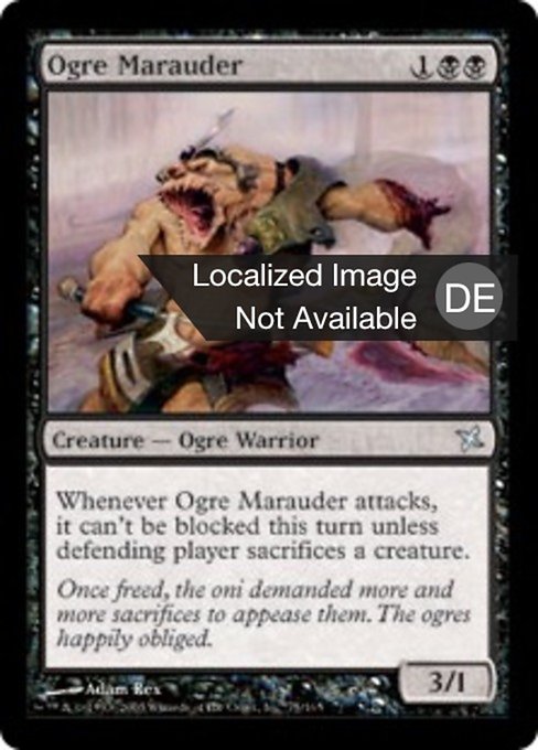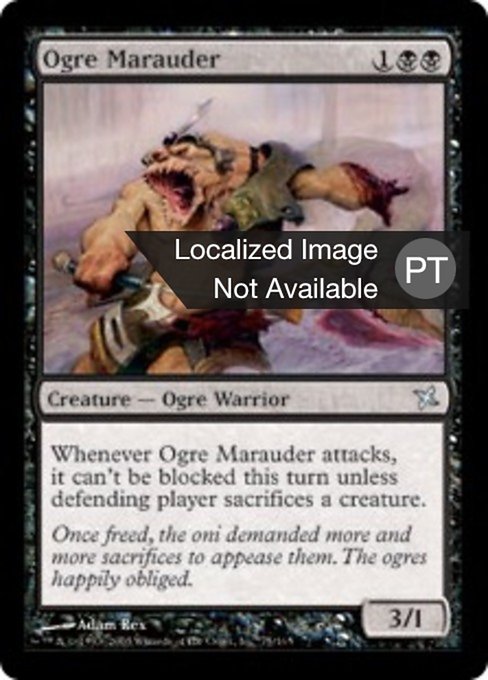 ![]() Variations— Parts— | Ogre Marauder3 / 1 Whenever this creature attacks, it gains "this creature can't be blocked" until end of turn unless defending player sacrifices a creature of their choice.