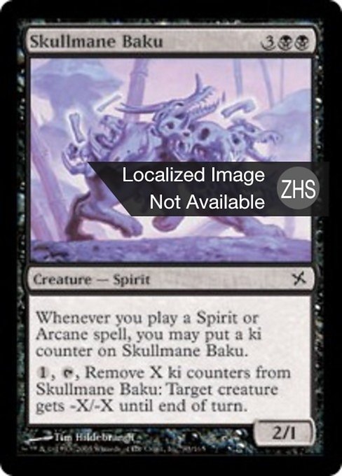 ![]() Variations— Parts— | Skullmane Baku2 / 1 Whenever you cast a Spirit or Arcane spell, you may put a ki counter on this creature.