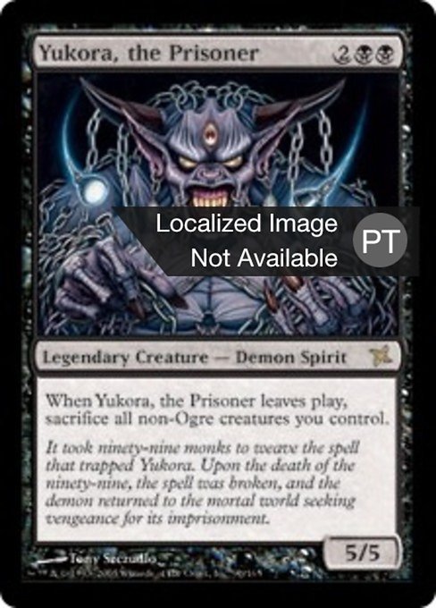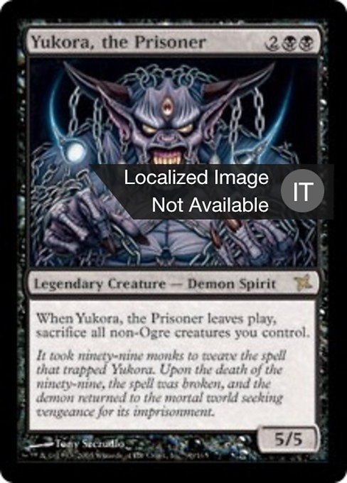 ![]() Variations— Parts— | Yukora, the Prisoner5 / 5 When Yukora leaves the battlefield, sacrifice all non-Ogre creatures you control.