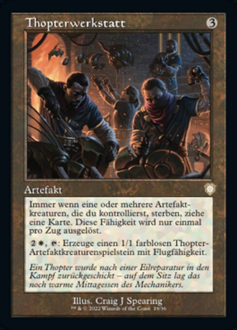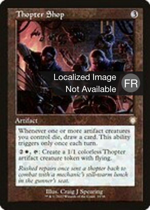 ![]() Variations : 1Parts : 2 | Thopter ShopWhenever one or more artifact creatures you control die, draw a card. This ability triggers only once each turn.