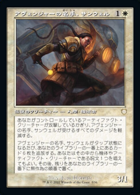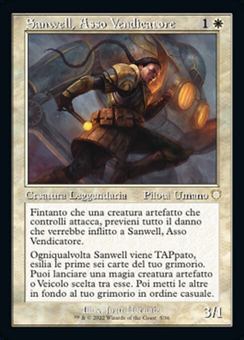 |  Variations : 1Parts— | Sanwell, Avenger Ace3 / 1 As long as an artifact creature you control is attacking, prevent all damage that would be dealt to Sanwell. Whenever Sanwell becomes tapped, exile the top six cards of your library. You may cast a Vehicle or artifact creature spell from among them. Then put the rest on the bottom of your library in a random order.
