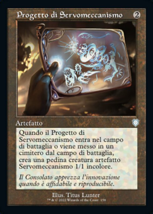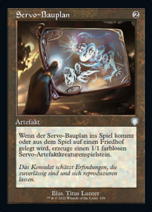 ![]() Variations— Parts— | Boceto de servoCuando el Boceto de servo entre al campo de batalla o vaya a un cementerio desde el campo de batalla, crea una ficha de criatura artefacto Servo incolora 1/1.