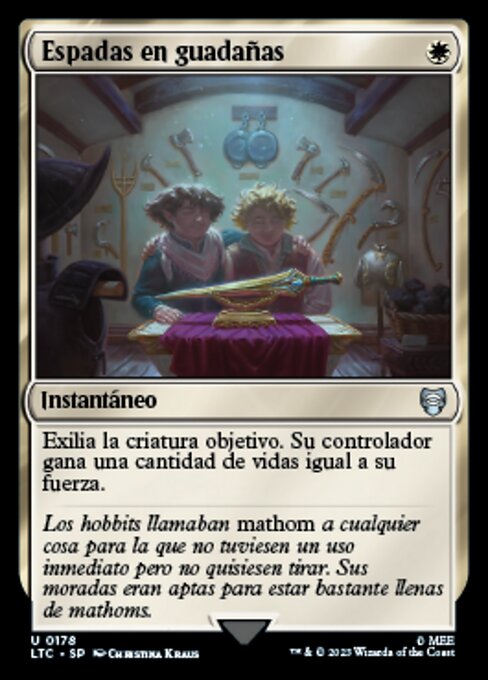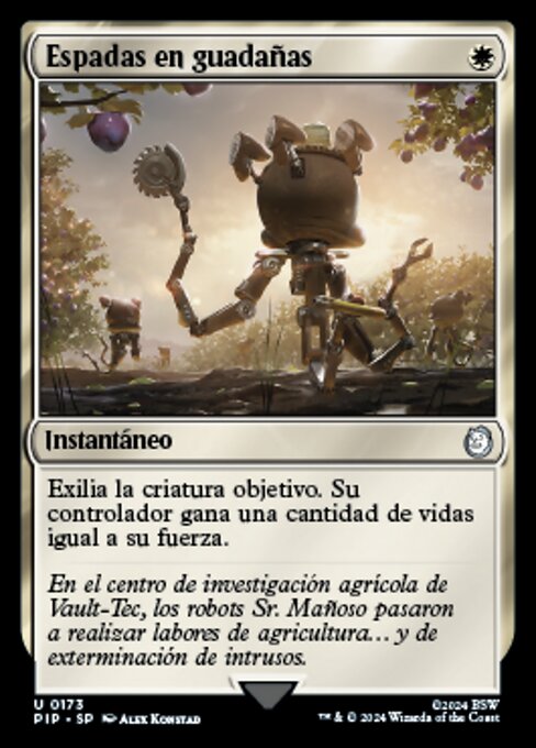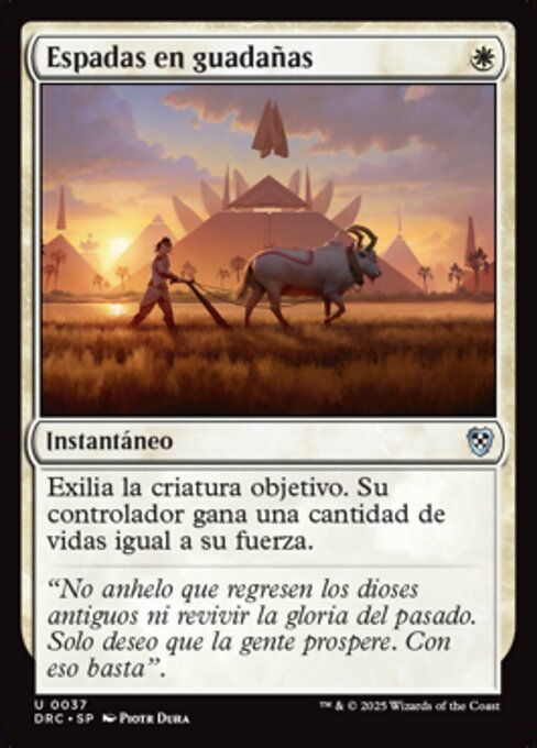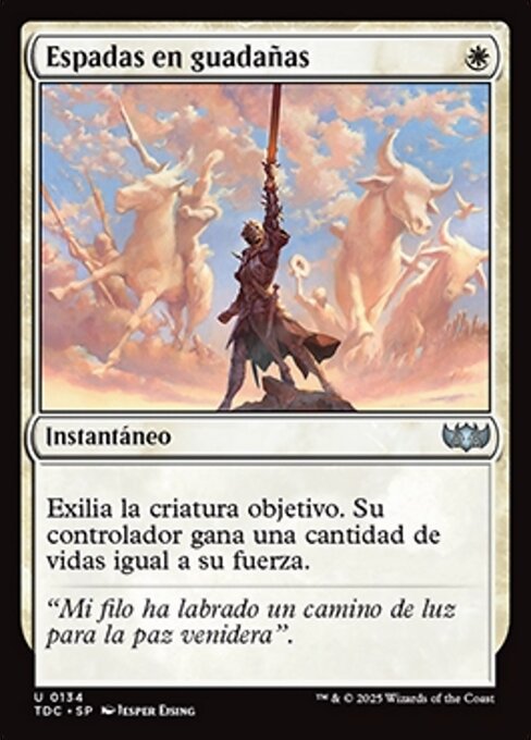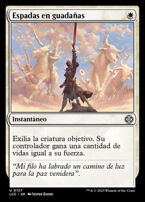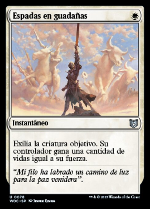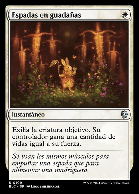 ![]() Variations— Parts— | Espadas en guadañasExilia la criatura objetivo. Su controlador gana una cantidad de vidas igual a su fuerza.