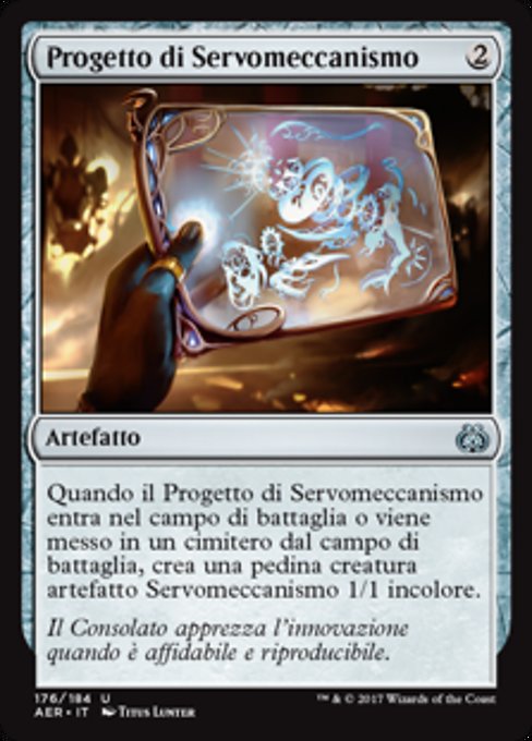 ![]() Variations— Parts— | Progetto di ServomeccanismoQuando il Progetto di Servomeccanismo entra nel campo di battaglia o viene messo in un cimitero dal campo di battaglia, crea una pedina creatura artefatto Servomeccanismo 1/1 incolore.