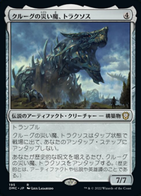 ![]() Variations— Parts— | クルーグの災い魔、トラクソス7 / 7 トランプル クルーグの災い魔、トラクソスはタップ状態で戦場に出て、あなたのアンタップ・ステップにアンタップしない。 あなたが歴史的な呪文を唱えるたび、クルーグの災い魔、トラクソスをアンタップする。(歴史的とは、アーティファクトや伝説や英雄譚のことである。)