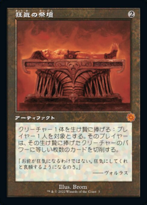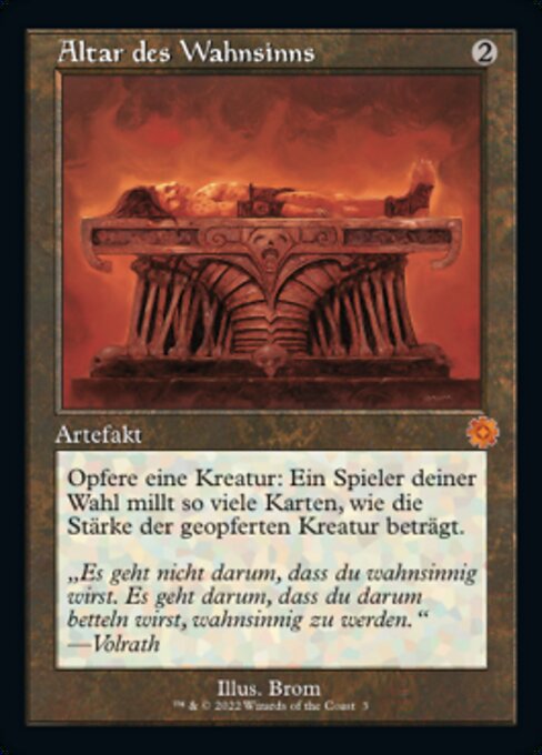 |  Variations : 1Parts— | Altar de la demenciaSacrificar una criatura: El jugador objetivo muele una cantidad de cartas igual a la fuerza de la criatura sacrificada.