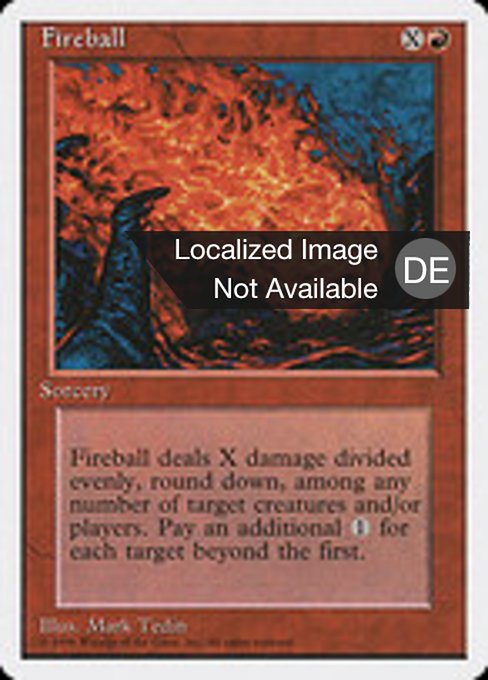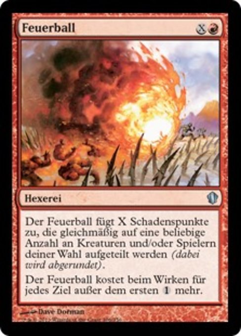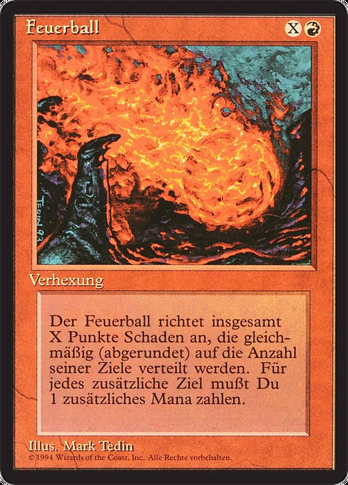 |  Variations— Parts— | FeuerballDer Feuerball fügt X Schadenspunkte zu, die gleichmäßig auf eine beliebige Anzahl an Kreaturen und/oder Spielern deiner Wahl aufgeteilt werden (dabei wird abgerundet).Der Feuerball kostet beim Wirken für jedes Ziel außer dem ersten