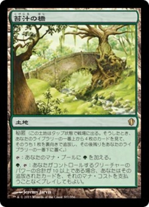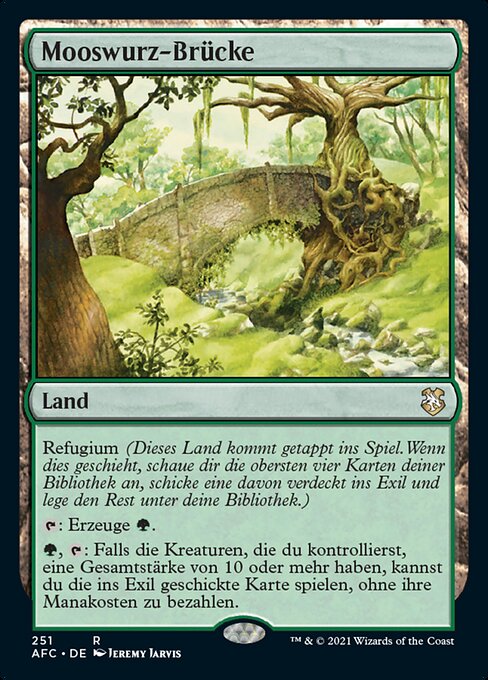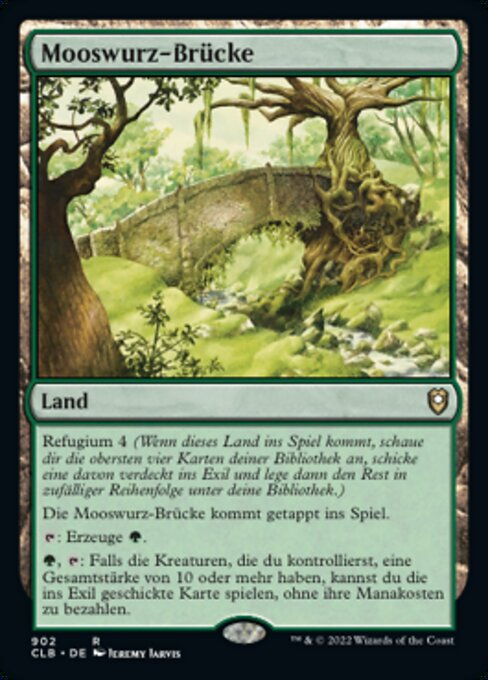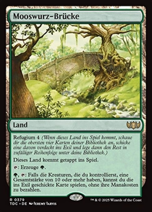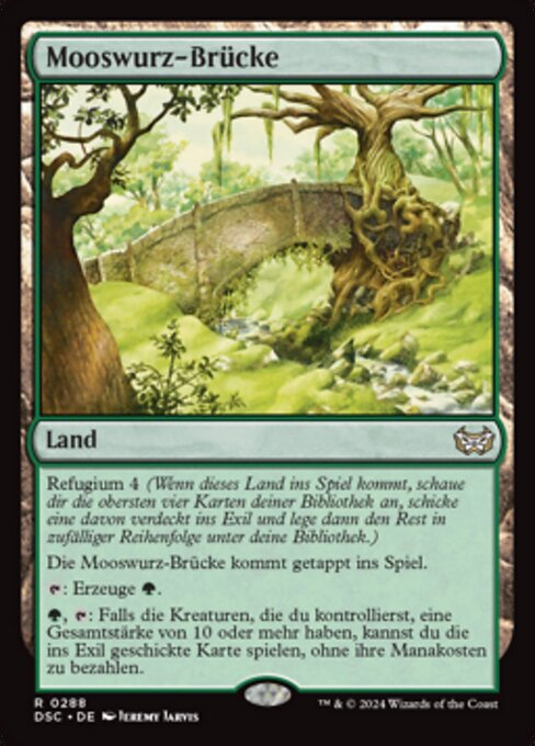![]() Variations— Parts— | Mooswurz-BrückeRefugium (Dieses Land kommt getappt ins Spiel. Wenn dies geschieht, schaue dir die obersten vier Karten deiner Bibliothek an, schicke eine davon verdeckt ins Exil und lege den Rest unter deine Bibliothek.)