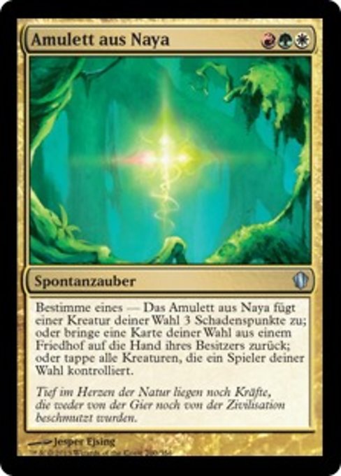 |  Variations— Parts— | Naya CharmChoose one — • Naya Charm deals 3 damage to target creature. • Return target card from a graveyard to its owner's hand. • Tap all creatures target player controls.