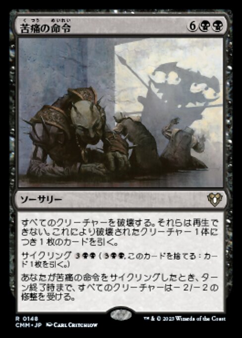 |  Variations— Parts— | 苦痛の命令すべてのクリーチャーを破壊する。それらは再生できない。これにより破壊されたクリーチャー1体につき、カードを1枚引く。サイクリング