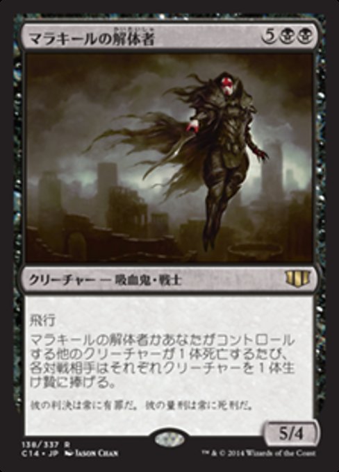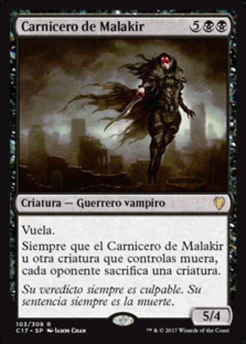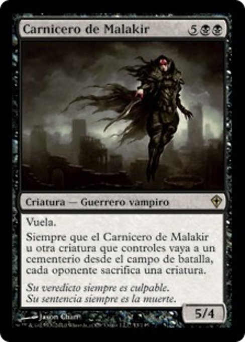 |  Variations— Parts— | Carnicero de Malakir5 / 4 Vuela. Siempre que el Carnicero de Malakir u otra criatura que controlas muera, cada oponente sacrifica una criatura.