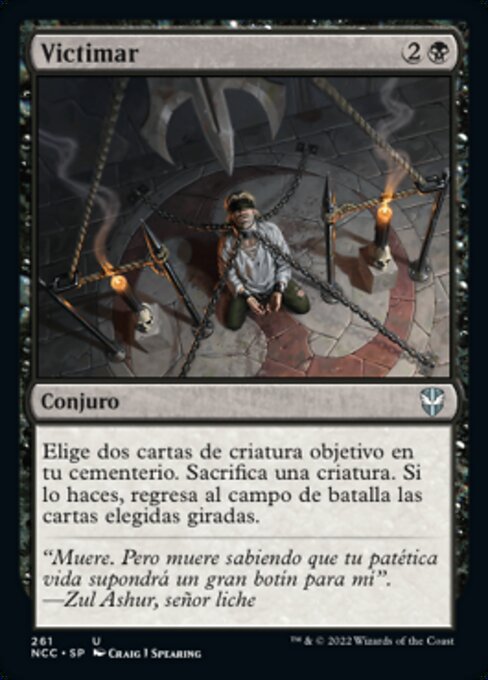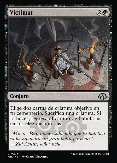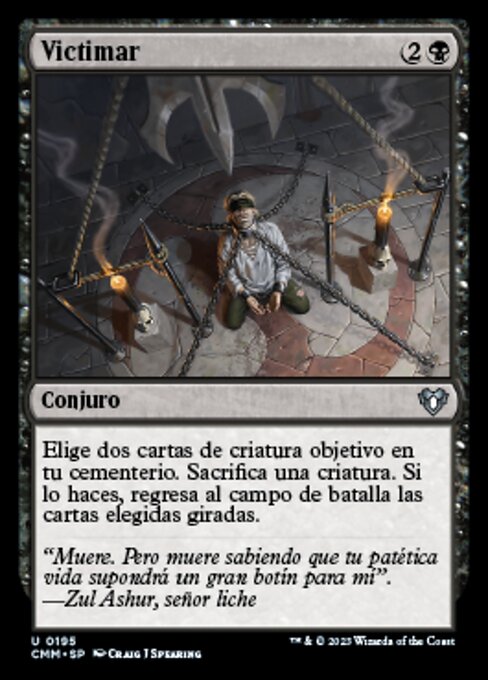 ![]() Variations— Parts— | VictimarElige dos cartas de criatura objetivo de tu cementerio. Sacrifica una criatura. Si lo haces, regresa las cartas elegidas al campo de batalla giradas.