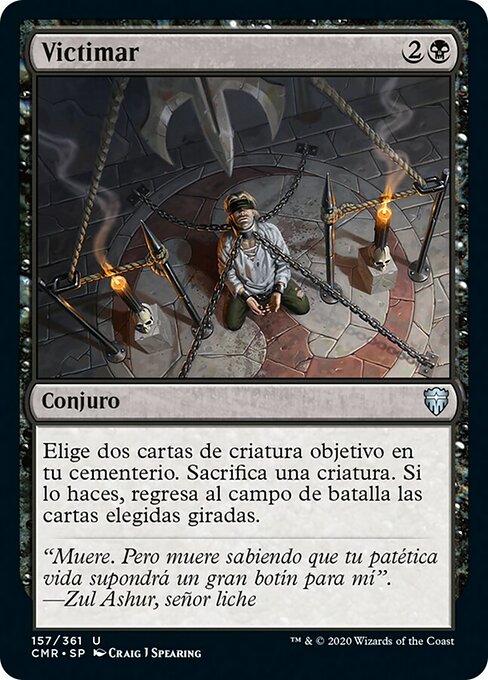 LegalitiesLegal Duel Brawl Predh Legacy Modern Vintage Historic Timeless Commander Gladiator Premodern Oathbreaker Not Legal Penny Future Pauper Alchemy Pioneer Standard Oldschool Standardbrawl Paupercommander RulingsThe creature you sacrifice isn't chosen until Victimize resolves. You can't return the creature you sacrifice because it will still be on the battlefield at the time targets are chosen.