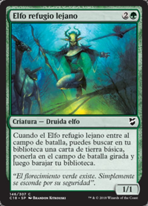 |  Variations— Parts— | Elfo refugio lejano1 / 1 Cuando el Elfo refugio lejano entre al campo de batalla, puedes buscar en tu biblioteca una carta de tierra básica y ponerla en el campo de batalla girada. Si lo haces, baraja tu biblioteca.