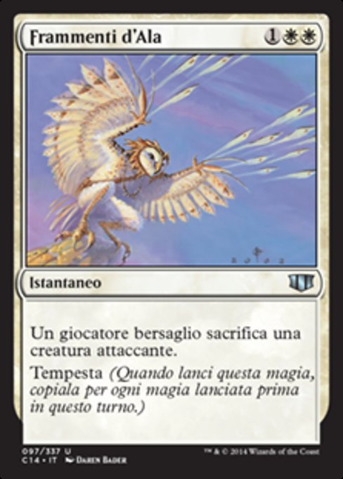 |  Variations— Parts— | Fragmentos de alaEl jugador objetivo sacrifica una criatura atacante. Tormenta. (Cuando lances este hechizo, cópialo por cada hechizo lanzado antes que él en este turno.)