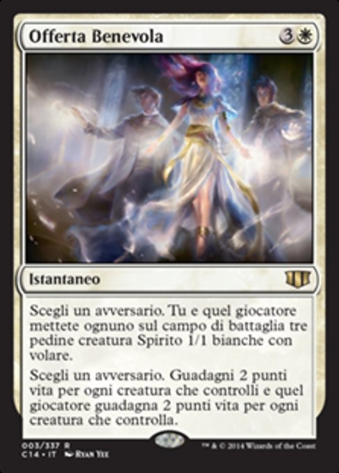 ![]() Variations— Parts— | Offrande bienveillanteChoisissez un adversaire. Ce joueur et vous mettez chacun sur le champ de bataille trois jetons de créature 1/1 blanche Esprit avec le vol. Choisissez un adversaire. Vous gagnez 2 points de vie pour chaque créature que vous contrôlez et ce joueur gagne 2 points de vie pour chaque créature qu'il contrôle.