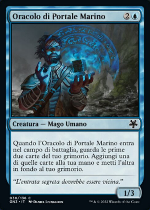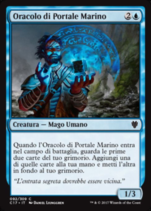 ![]() Variations— Parts— | Oracolo di Portale Marino1 / 3 Quando l'Oracolo di Portale Marino entra nel campo di battaglia, guarda le prime due carte del tuo grimorio. Aggiungi una di quelle carte alla tua mano e metti l'altra in fondo al tuo grimorio.