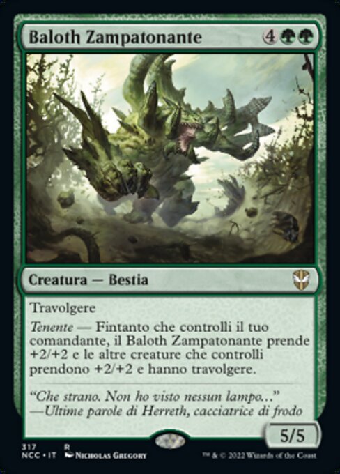 |  Variations— Parts— | Baloth Zampatonante5 / 5 Travolgere Tenente — Fintanto che controlli il tuo comandante, il Baloth Zampatonante prende +2/+2 e le altre creature che controlli prendono +2/+2 e hanno travolgere.