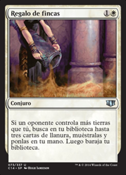 |  Variations— Parts— | Dono dell'EstateSe un avversario controlla più terre di te, passa in rassegna il tuo grimorio per trovare fino a tre carte Pianura, rivelale e aggiungile alla tua mano. Poi rimescola il tuo grimorio.