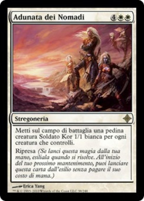 ![]() Variations— Parts— | Adunata dei NomadiMetti sul campo di battaglia una pedina creatura Soldato Kor 1/1 bianca per ogni creatura che controlli. Ripresa (Se lanci questa magia dalla tua mano, esiliala mentre si risolve. All'inizio del tuo prossimo mantenimento, puoi lanciare questa carta dall'esilio senza pagare il suo costo di mana.)