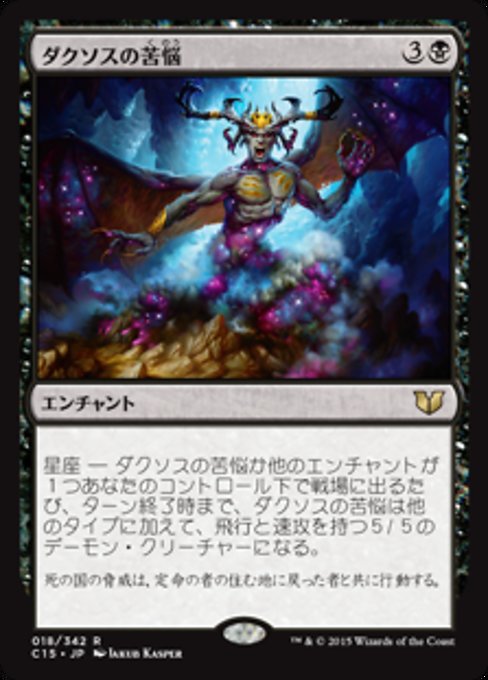 ![]() Variations— Parts— | Daxos's TormentConstellation — Whenever this enchantment or another enchantment you control enters, this enchantment becomes a 5/5 Demon creature with flying and haste in addition to its other types until end of turn.