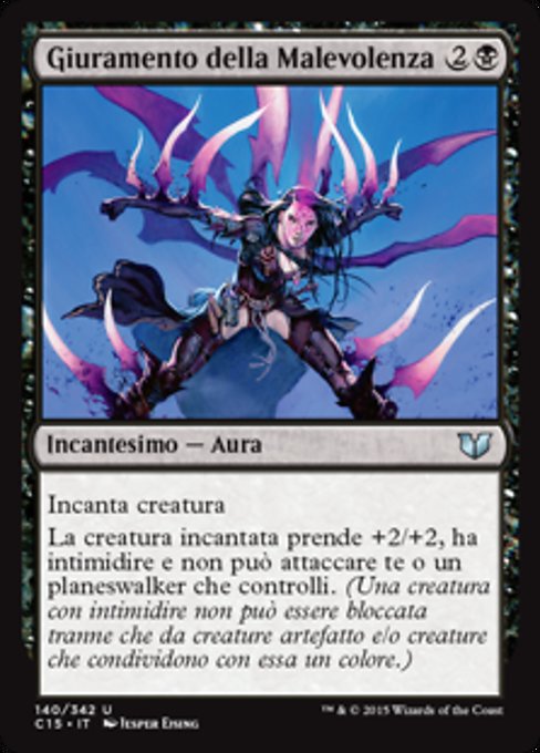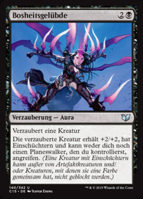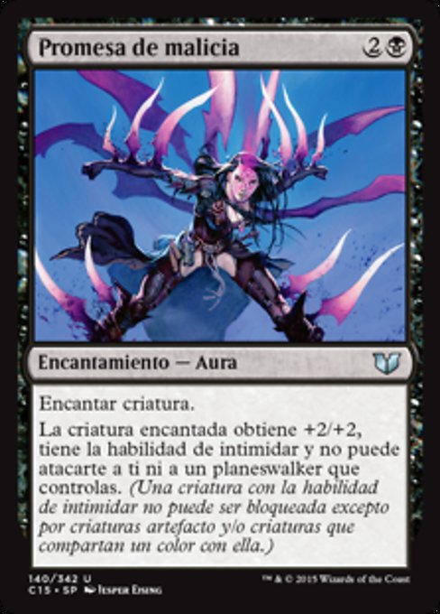 ![]() Variations— Parts— | Promesa de maliciaEncantar criatura.La criatura encantada obtiene +2/+2, tiene la habilidad de intimidar y no puede atacarte a ti ni a un planeswalker que controlas. (Una criatura con la habilidad de intimidar no puede ser bloqueada excepto por criaturas artefacto y/o criaturas que compartan un color con ella.)