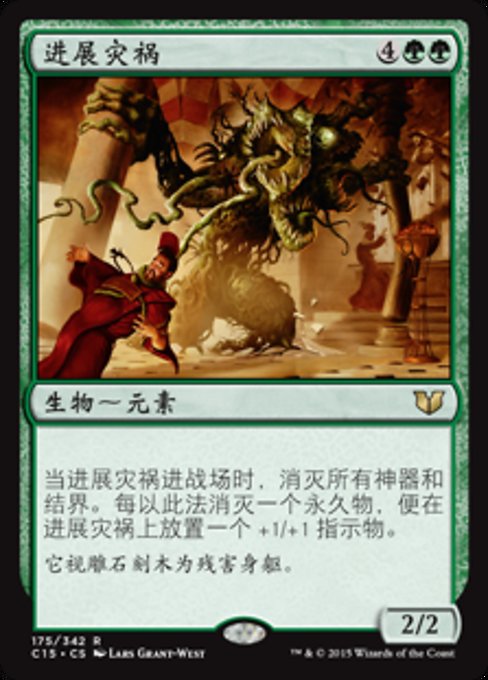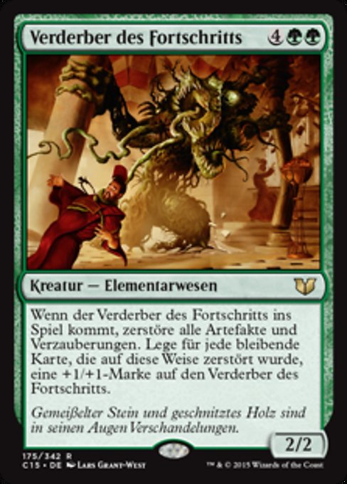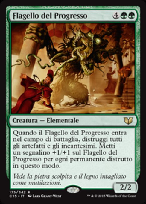 ![]() Variations— Parts— | Ruina del progreso2 / 2 Cuando la Ruina del progreso entre al campo de batalla, destruye todos los artefactos y encantamientos. Pon un contador +1/+1 sobre la Ruina del progreso por cada permanente destruido de esta manera.