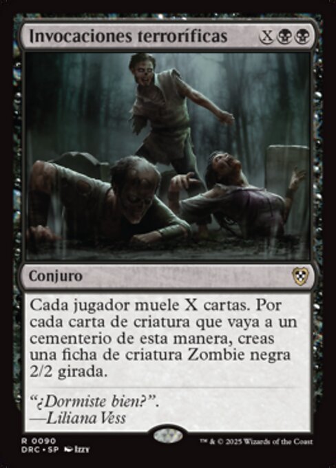 ![]() Variations— Parts— | Invocaciones terroríficasCada jugador pone las X primeras cartas de su biblioteca en su cementerio. Por cada carta de criatura que vaya a un cementerio de esta manera, pones en el campo de batalla una ficha de criatura Zombie negra 2/2 girada.