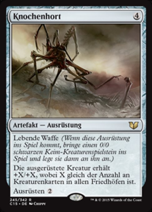![]() Variations— Parts— | HuesotesoroArma viviente. (Cuando este equipo entre al campo de batalla, pon en el campo de batalla una ficha de criatura Germen negra 0/0 y luego anéxalo a ella.)La criatura equipada obtiene +X/+X, donde X es la cantidad de cartas de criatura en todos los cementerios.Equipar