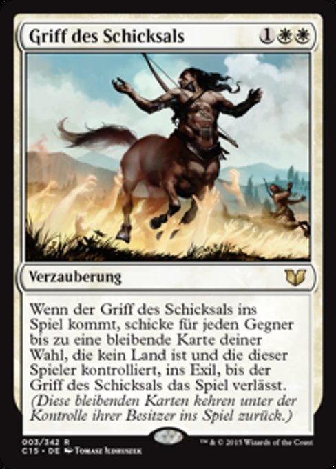 ![]() Variations— Parts— | Yugo del destinoCuando el Yugo del destino entre al campo de batalla, por cada oponente, exilia hasta un permanente objetivo que no sea tierra que controla ese jugador hasta que el Yugo del destino deje el campo de batalla. (Esos permanentes regresan bajo el control de sus propietarios.)