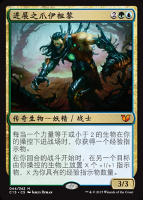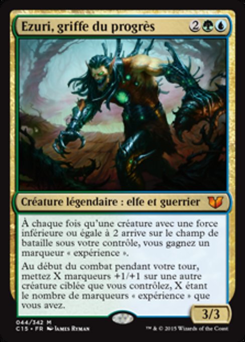 |  Variations— Parts— | Ezuri, la Garra del Progreso3 / 3 Siempre que una criatura con fuerza de 2 o menos entre al campo de batalla bajo tu control, obtienes un contador de experiencia.Al comienzo del combate en tu turno, pon X contadores +1/+1 sobre otra criatura objetivo que controlas, donde X es la cantidad de contadores de experiencia que tengas.