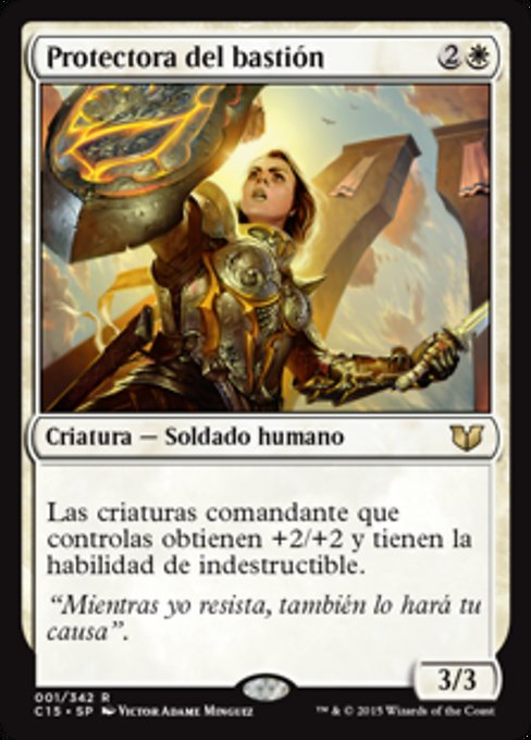 |  Variations— Parts— | Protettrice del Baluardo3 / 3 Le creature comandante che controlli prendono +2/+2 e hanno indistruttibile.
