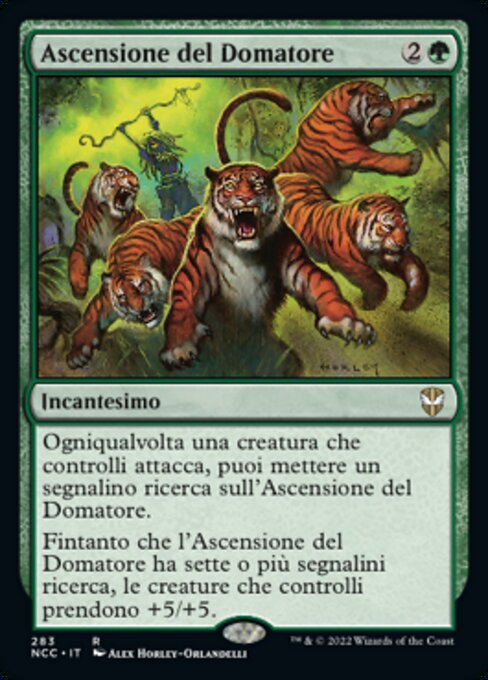 |  Variations— Parts— | Ascensione del DomatoreOgniqualvolta una creatura che controlli attacca, puoi mettere un segnalino ricerca sull'Ascensione del Domatore.Fintanto che l'Ascensione del Domatore ha sette o più segnalini ricerca, le creature che controlli prendono +5/+5.
