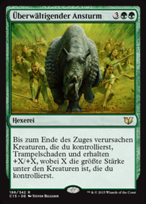 LegalitiesLegal Duel Penny Predh Legacy Modern Vintage Commander Oathbreaker Not Legal Brawl Future Pauper Alchemy Pioneer Historic Standard Timeless Gladiator Oldschool Premodern Standardbrawl Paupercommander RulingsYou check the power of your creatures as Overwhelming Stampede resolves. For example, if you control a 2/1 creature, a 2/2 creature, a 2/4 creature, a 4/1 creature, a 5/5 creature, and a 5/6 creature at that time, each of your creatures gets +5/+5 and gains trample until end of turn.